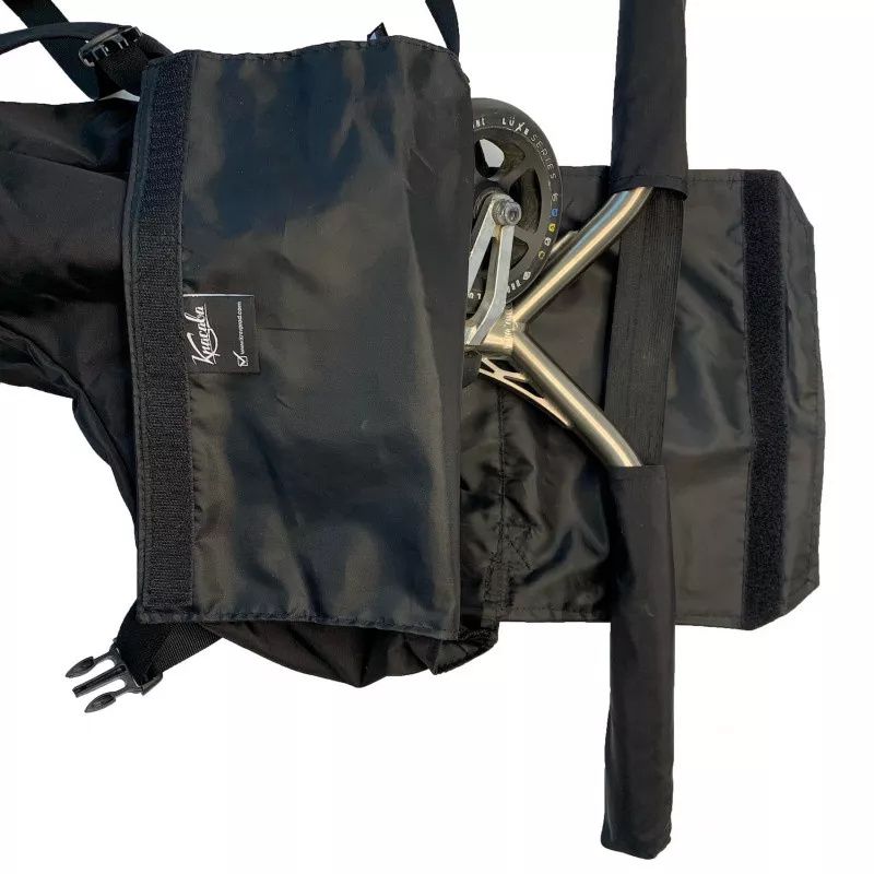 Už vás nebaví tahat koloběžku v rukách? Furt vám padá a nemůžete být na svém instagramu, protože nemáte volné ruce? Máme řešení! Kupte si tento batoh! Snadno koloběžku nasadíte do popruhů, přitáhnete a můžete ji pohodlně nést! Vnější materiál batohu je tkanina Cordon 500D PU. V batohu jsou kapsy na drobnější předměty a oddělená kapsa pro řidítka aby se nepobouchali při přepravě.  Délka batohu je 90 cm a šířka je 38 cm. Do tohoto batohu se vejde jakákoliv velikost koloběžky!