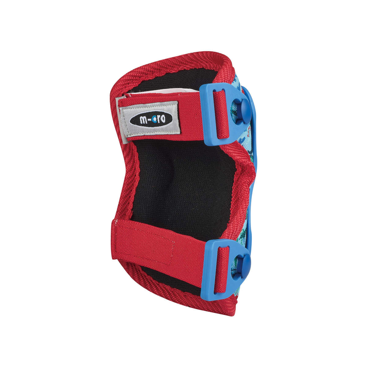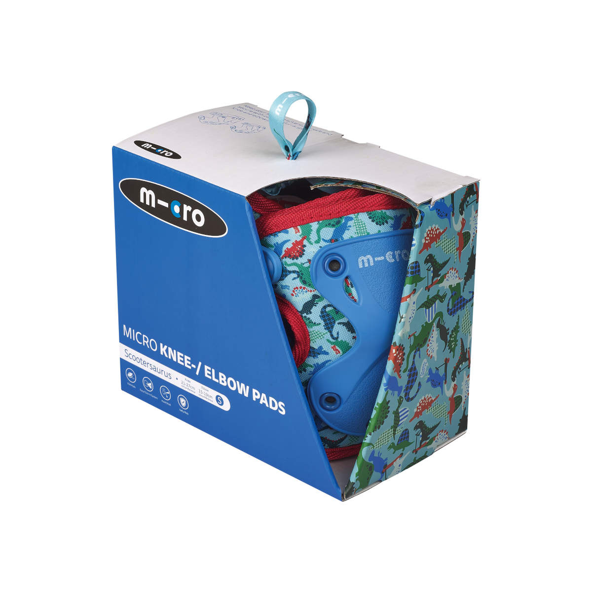 Dětské chrániče kolen a loktů v modro-červené kombinaci s motivem dinosaurů. Barevný motiv je neutrální, takže by se měl chránič líbit jak klukům tak i holčičkám, ale motiv dinosaurů pravděpodobně zaujme spíše kluky. Chrániče pomáhají zabránit zbytečným nárazům a odřeninám. Pro přesné nastavení velikosti jsou chrániče vybaveny popruhy se suchým zipem. Tyto nastavitelné pásky spolu s textilní prodyšnou elastickou membránou zajistí, že chránič bude dobře držet. Vylepšený systém zaklapnutí (Easy Click-In System) umožňuje rychlejší nasazení chrániče bez nutnosti nového nastavení suchého zipu. Vnější prémiový tvrzený plast je navržen tak, aby byl houževnatý a trvanlivý. Je také anatomicky tvarován pro příjemné používání. Komfort při používání, ale i při pádu zaručuje vnitřní silné polstrování.