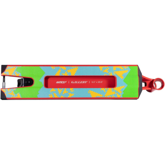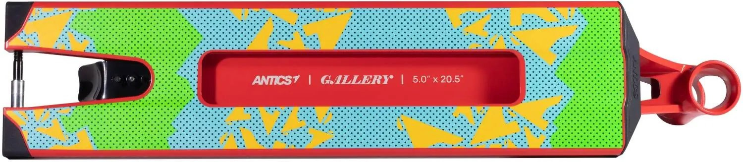 Značka Antics byla založena lidmi, kteří dříve byli součástí North Scooters. Deska Antics Gallery se vyrábí z kvalitního hliníku 6061 se stupněm pevnosti materiálu T6. Deska je svařovaná ze dvou dílů. Hmotnost desky je krásných 1694g a to díky lehkému ale zároveň pevnému hliníku. Rozměry desky jsou 520mm na délku, 127mm na šířku a 360mm jako footspace. Do desky se vejdou kolečka o maximálních rozměrech 125x30mm. Na konci desky je bezpružinková flex fender brzda.