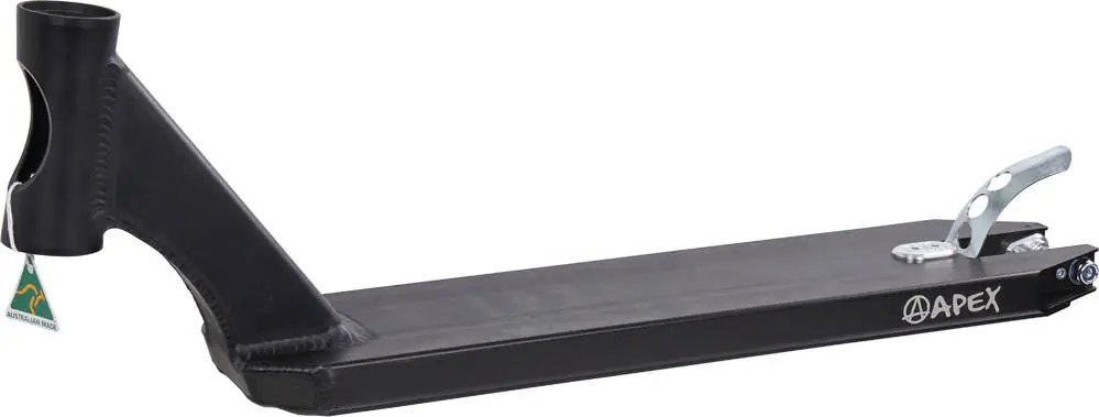 Australská značka Apex, která vyrábí nejlepší desky na trhu. Hlavní výhodou a jako jediní mají dvojitý svar na rizikových místech. Délka desky je 49 cm a šířka 11,4 cm. Tudíž je deska vhodná pro park jezdce a hlavně pro kickless mástry.