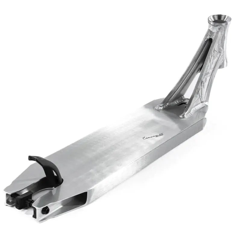 Hmotnost Ethic Erawan V2 desky je totální nesmysl, je to pouhých 1335 gramů! Této váhy se dosáhlo díky tomu že je deska vyráběna z kvalitního a zároveň lehkého hliníku. Deska má rozměry 540 mm na délku, 120 mm na šířku a 360 mm jako footspace. Krk desky je svařovaný ze dvou dílů a je dělaný pro integrované hlavové složení. Deska má konkávnost, takže vám z ní jen tak nesjedou nohy. Do desky se vejdou kolečka o maximálních rozměrech 120x24 mm. Na konci desky je bezpružinková flex fender brzda z kvalitního plastu.