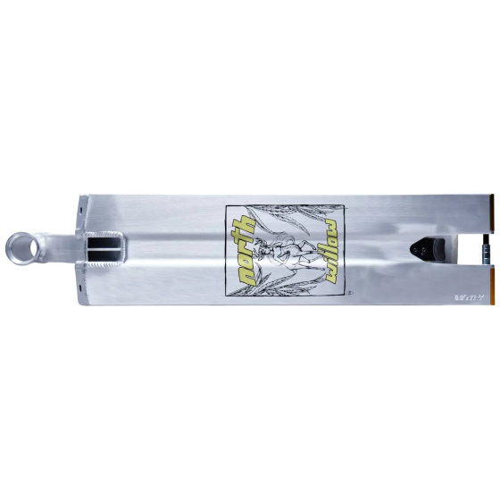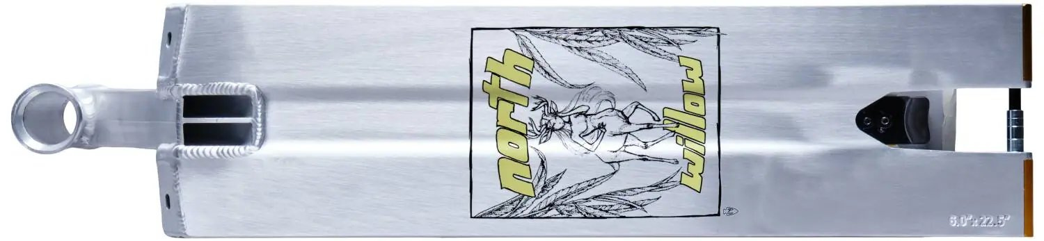 North Scooters je kanadská značka zaměřená primárně na streetové ježdění. Hmotnost této desky je 2020 gramů což je super vůči rozměrům desky, které jsou 22.5"/572 mm na délku, 6"/152 mm na šířku a 426 mm jako footspace (místo pro nohy). Materiál desky je kvalitní Hliník a jelikož je deska vyráběna z jednoho kusu tak není na žádném místě oslabená a vydrží pořádnou dávku zátěže. Do desky budou pasovat kolečka o maximálním průměru a šířce 120x30 mm. Na konci desky je ocelový nepohyblivý fender.