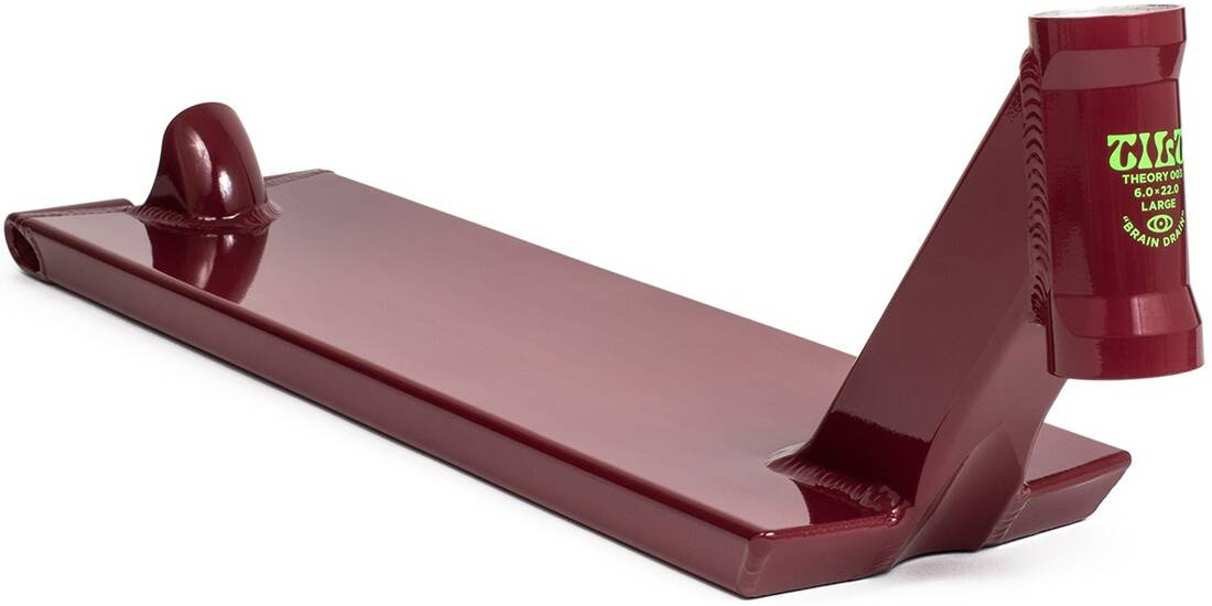 Nová generace Tilt Theory desek je tu! Theory je jedna z nejlepších street desek. Má hranatý tvar a tzv. "Crook Nook" v přední části desky. Díky tomu vám půjdou snadněji nose griny. Deska nemá grindraily díky tomu se vám bude daleko snadnějí jezdit na trubkách. Deska má integrovanou brzdičku, svařovanou. Tzv. jezdíte breakless. Do desky vlezou kolečka 120mm se šířkou 24mm i 30mm! Krk desky je dvoudílný a pro integroavané headsety.