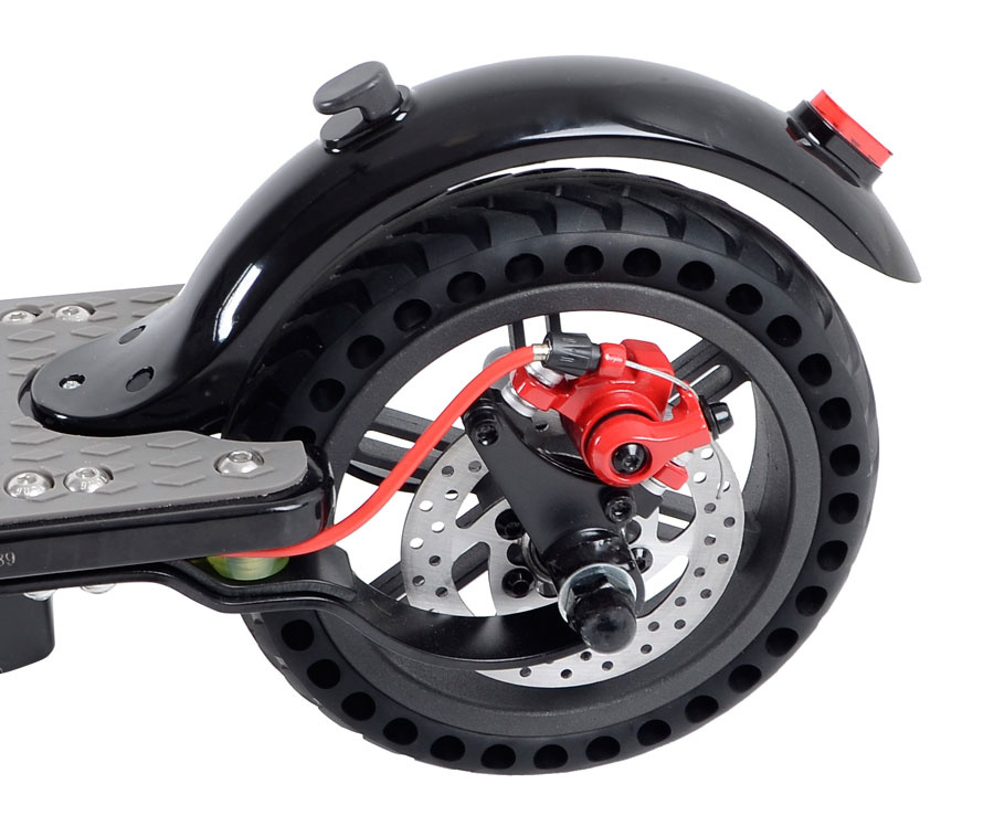 Koloběžku spolehlivě zastavíte duální brzdou. Během brzdění zadní kotoučovou brzdou se automaticky aktivuje i přední elektronická brzda, což zvyšuje účinnost brzdění a šetří se brzdové destičky.