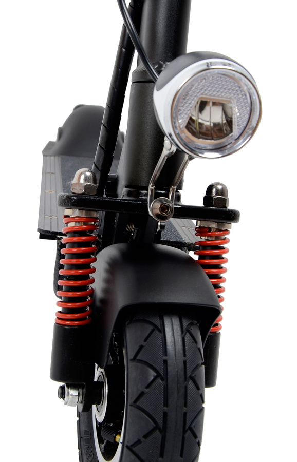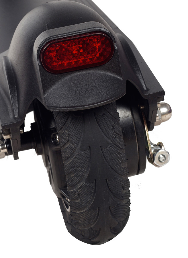 Pneu s průměrem 8\" (přední nafukovací, zadní pevné) snadno překonají i drobné nerovnosti. Odolný přední tlumič navíc snižuje nepříjemné vibrace v řídítkách. Kola jsou chráněna blatníky.