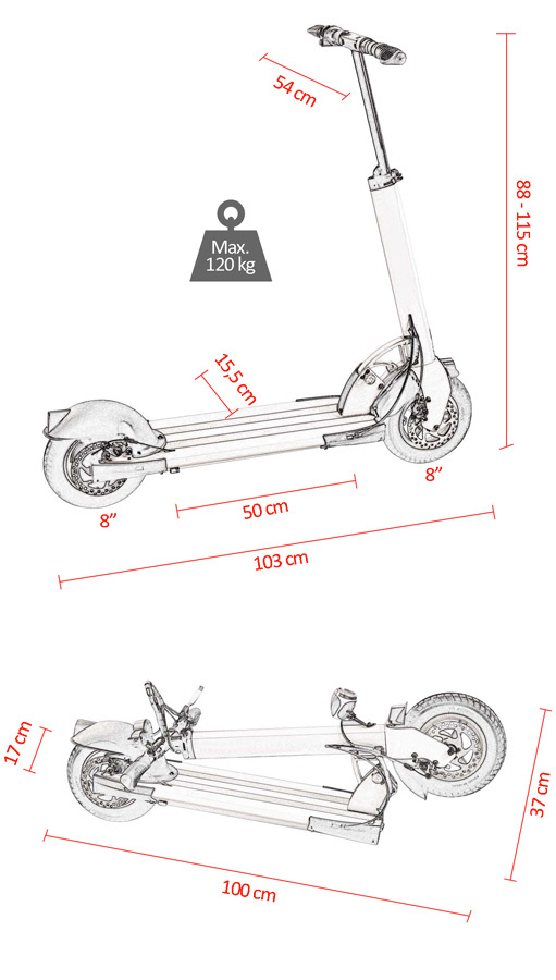 Rozměry složené koloběžky: 100 x 17 x 37 cm
