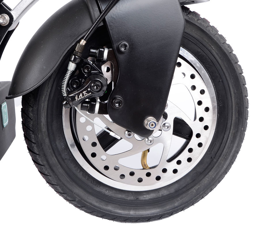 Koloběžku i při větších rychlostech spolehlivě zastavíte nezávislou zadní a přední mechanickou kotoučovou brzdou.