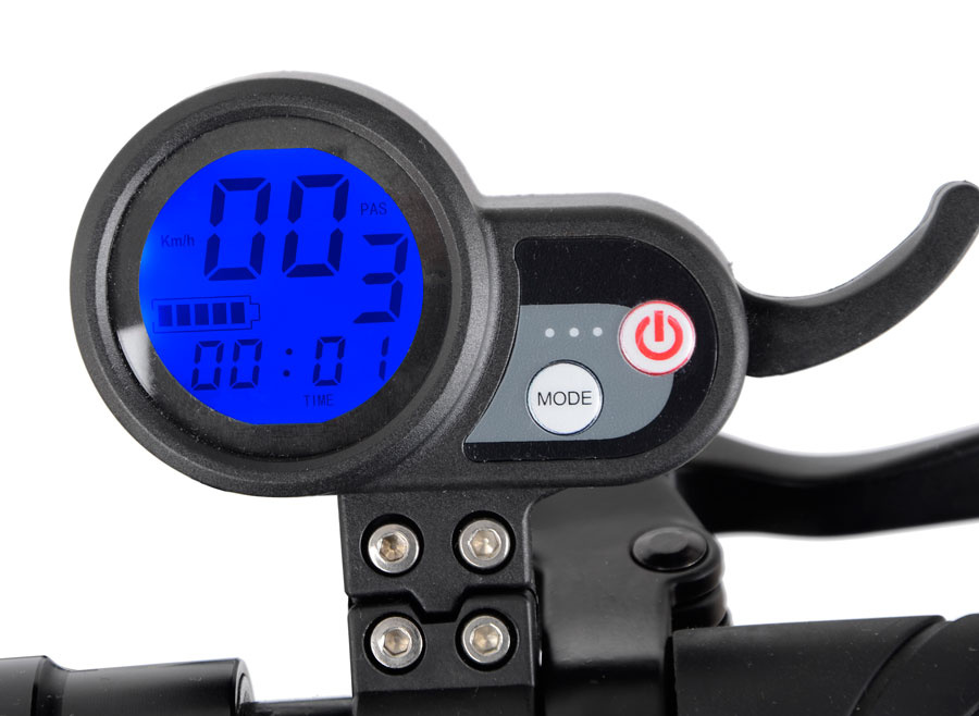Na transreflexním displeji skvěle čitelným i na přímém slunci či v noci můžete sledovat aktuální stav baterie, aktuální rychlost, dobu jízdy a ujetou vzdálenost. USB portem zezadu displeje lze dokonce nabíjet váš mobilní telefon či tablet, a to buď za jízdy nebo při stojící koloběžce pomocí 2-hodinového časovače.
