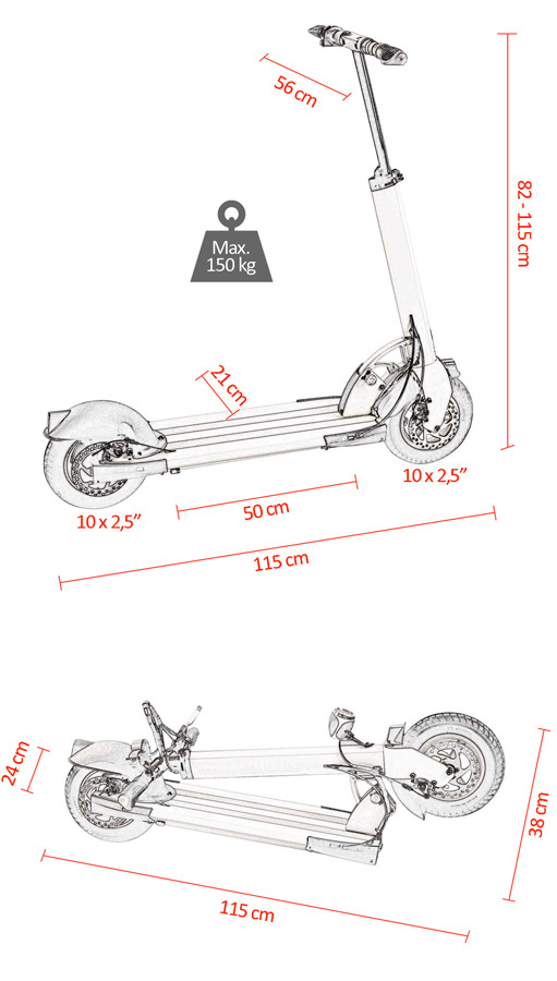 Rozměry rozložené koloběžky: 115 x 56 x 115 cm