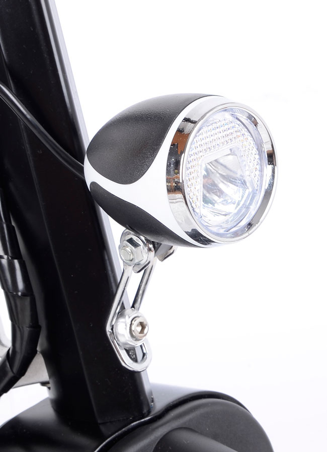 Přední i zadní světlo napájené z centrální baterie zapnete spínačem na řídítkách, kde je umístěno i tlačítko houkačky. Během brzdění se navíc rozsvítí zadní brzdové světlo.