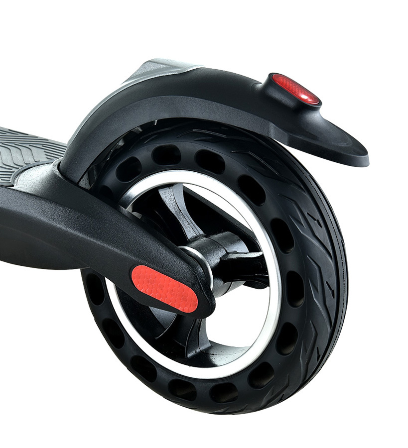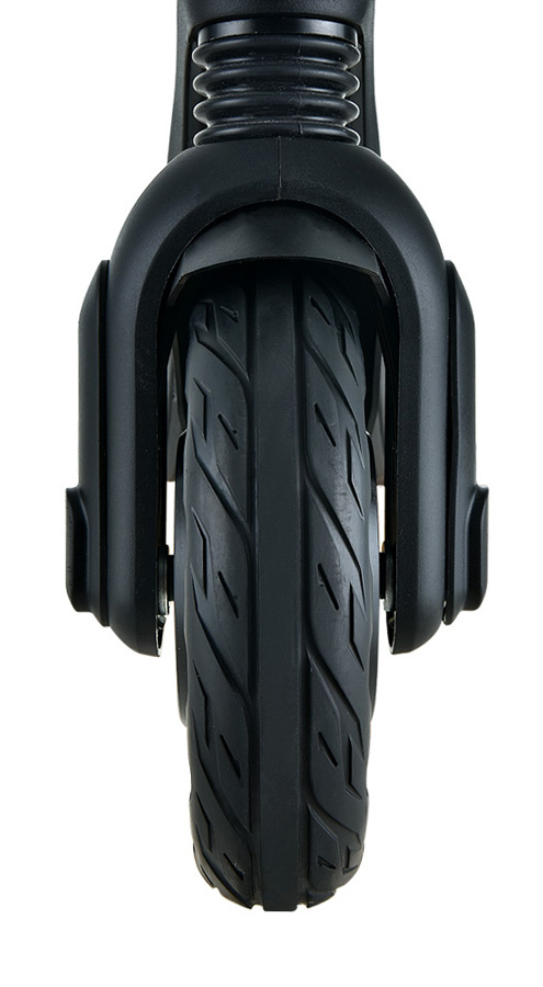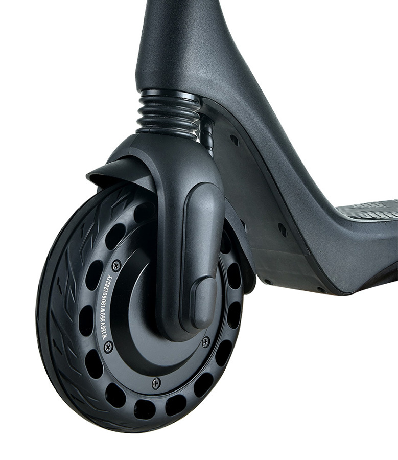 Lehký a pevný rám z leteckého hliníku je dimenzován na hmotnost jezdce do 120 kg. Přední a zadní pevné pneu není možné píchnout, což výrazně ulehčuje údržbu koloběžky. Nepříjemné vibrace řídítek pohlcuje přední tlumič.