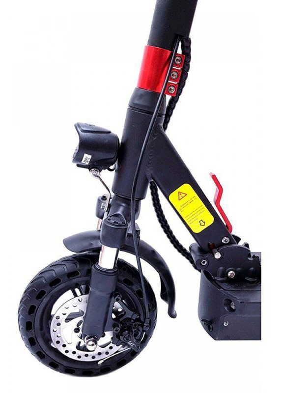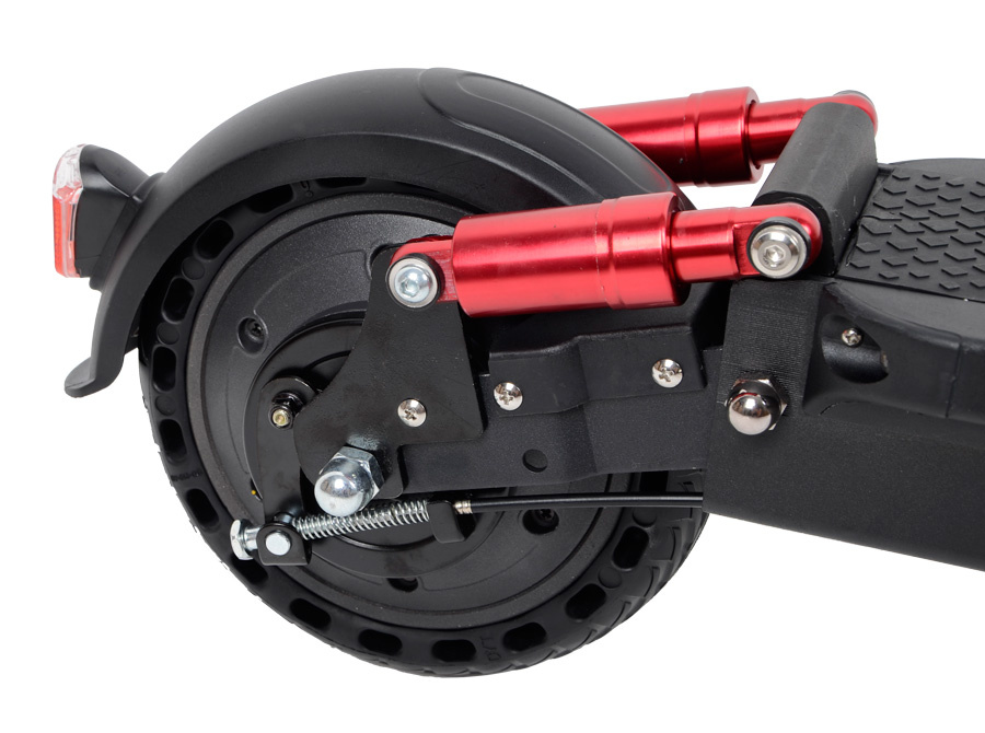 Přední i zadní pevné pneu nelze píchnout. Dvojité tlumiče na obou kolech pohlcují vibrace a vyrovnávají terénní nerovnosti, jízda je tak bezpečnější a pohodlná. K vyšší bezpečnosti přispívají i přední kotoučová a zadní bubnová brzda.