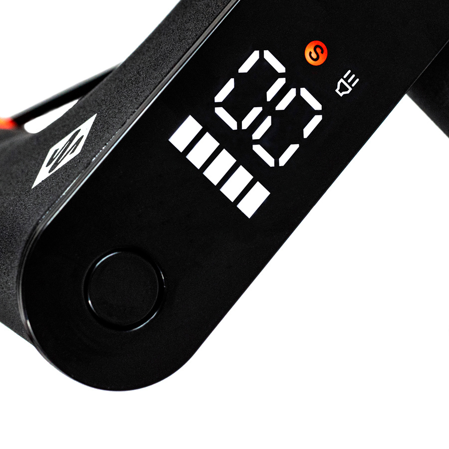 Na integrovaném LCD displeji můžete sledovat základní informace o koloběžce jako je aktuální rychlost, stav baterie, indikaci připojení přes bluetooth k mobilnímu telefonu, jízdní režim v jakém se koloběžka nachází a indikaci osvětlení. Tlačítkem na horní straně displeje můžete přepínat mezi 2 jízdními režimy pro omezení max. rychlosti a zapínat osvětlení.