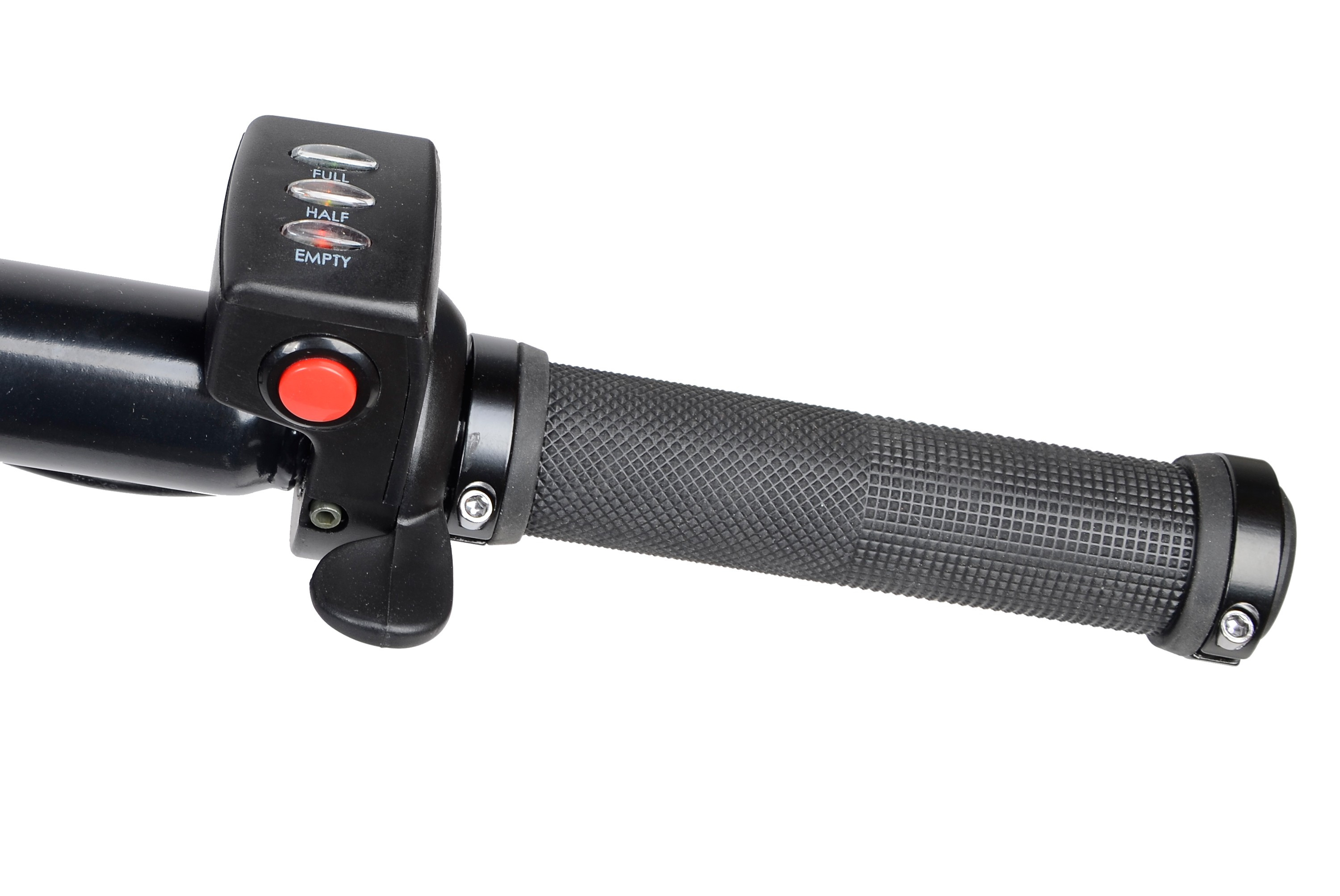 Plynová páčka na pravé rukojeti umožňuje plynulou regulaci rychlosti. Pro složitější manévrování nebo jízdu z kopce využijete zpětný chod, aktivovaný tlačítkem.