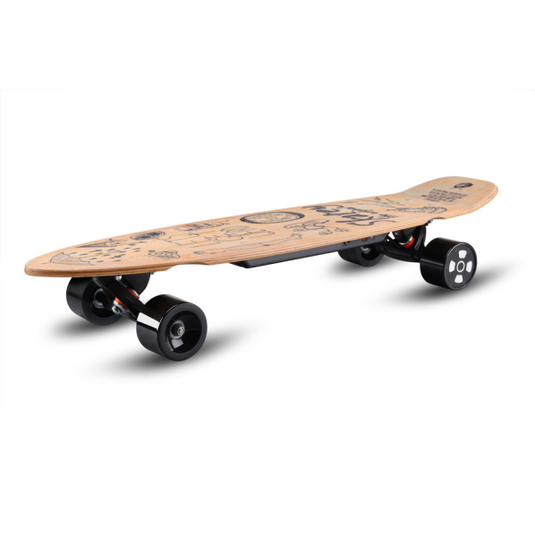 S velkými kolečky 80 mm snadno přejedete i drobné terénní nerovnosti. 350 W motor je integrovám přímo do zadního kolečka - při vypnutí elektrického pohonu klade motor min. odpor a longboard tak lze pohodlně pohánět i vlastním odrážením.