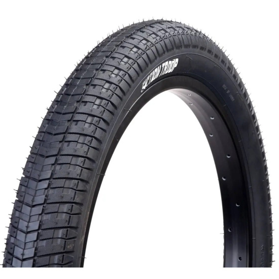 BMX pneumatika Fiction 18" Troop s polo-agresivním vzorem na plášti o šířce 62 mm. Dobrá volba, pokud hledáte dostupnou pneumatiku, protože se součástmi Fiction získáte skvělou hodnotu za nízkou cenu.