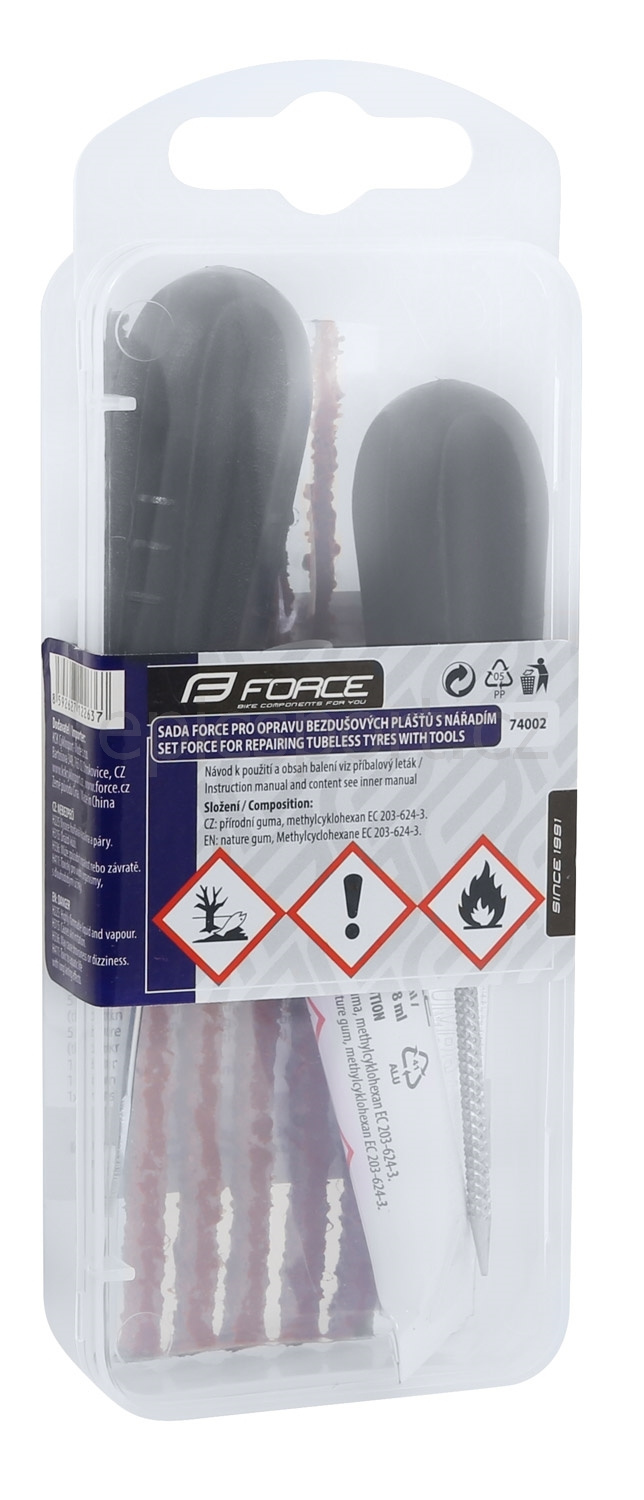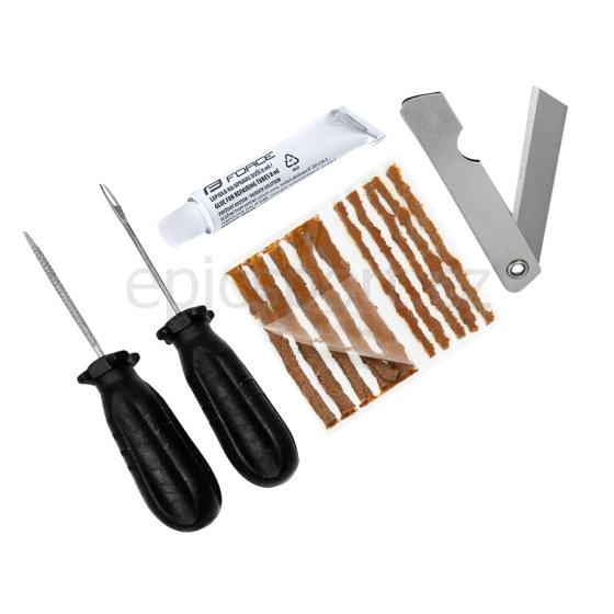Sada FORCE pro opravu defektu u bezdušových (tubeless) plášťů s nářadím obashuje: