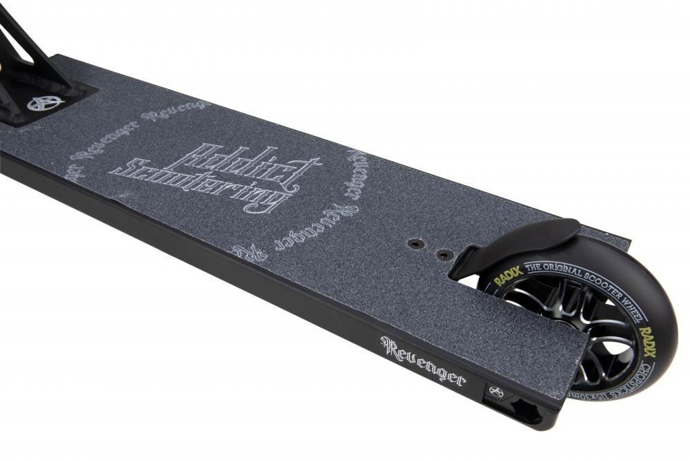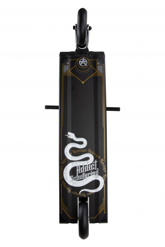 Pro rok 2021 Addict představil nový model Revenger koloběžky, která má obrovské parametry a je dělaná pro pokročilé jezdce na street. Koloběžka obsahuje Box-end desku o rozměrech 570 x 155 mm. Deska je vyráběna z tepelně upravovaného hliníku 6068 se stupňem pevnosti T6. Úhel desky krku je 83 stupňů. Na konci desky můžeme najít bezpružinkovou pohyblivou brzdu z oceli. K obrovské desce se také hodí obrovská řidítka a to Addict potvrdil a na koloběžku osadili ocelová řidítka ve tvaru T. Řidítka mají 720 mm na výšku a 680 mm na šířku. Celková výška řidítek od země je 980 mm. Koloběžka obsahuje hliníkovou vidlici s HIC kompresním systémem. Na řidítkách nalezneme dvojitou objímku, vyráběnou z hlíníku 6061, která v sobě má M8 šrouby. Koloběžka má klasické integrované hlavové složení. Na koloběžce jsou Eagle kolečka ze řady Chopsticks Radix o průměru 115 mm a šířce 30 mm s ložisky Eagle Supply 608 2RS, o kterých Eagle říká že jsou lepší než klasické ABEC-9.