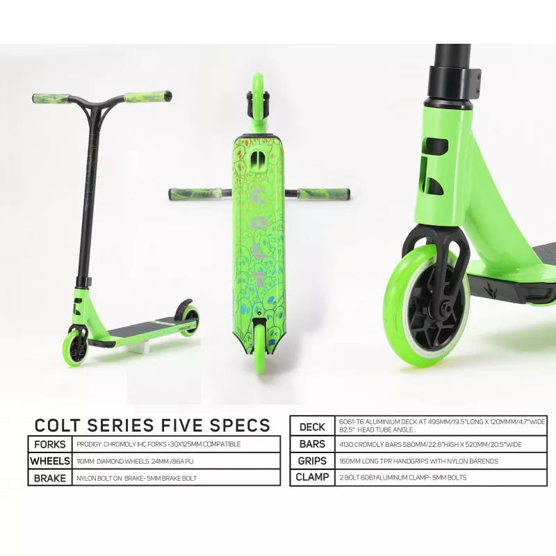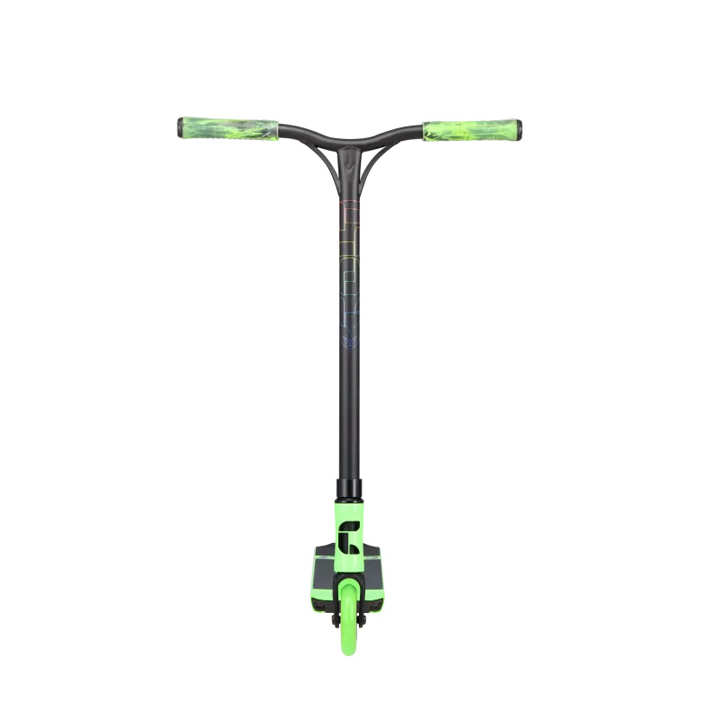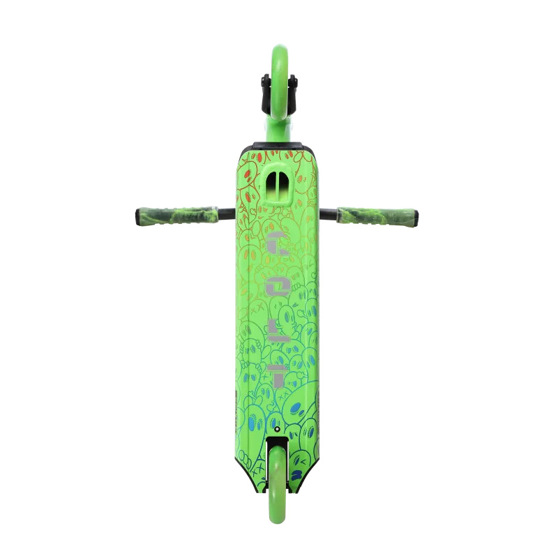 Super koloběžka vhodná pro mírně pokročilé jezdce do skateparku. S koloběžkou se vám budou dělat krásně triky jelikož váží pouhých 3740 gramů. Na koloběžku se dává deska o délce 495 mm a šířce 120 mm. V desce jsou plastové zábrany aby se materiál na koncích neohnul. Na koloběžce jsou řidítka o rozměrech 580 mm na 520 mm. Vidlice je z oceli a je na kompresní systém IHC (do vidlice se vejdou kolečka o rozměrech až 125x30 mm). Na koloběžce jsou osazeny 110 mm kolečka o šířce 24 mm s ABEC 9 ložisky.
