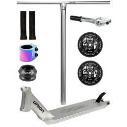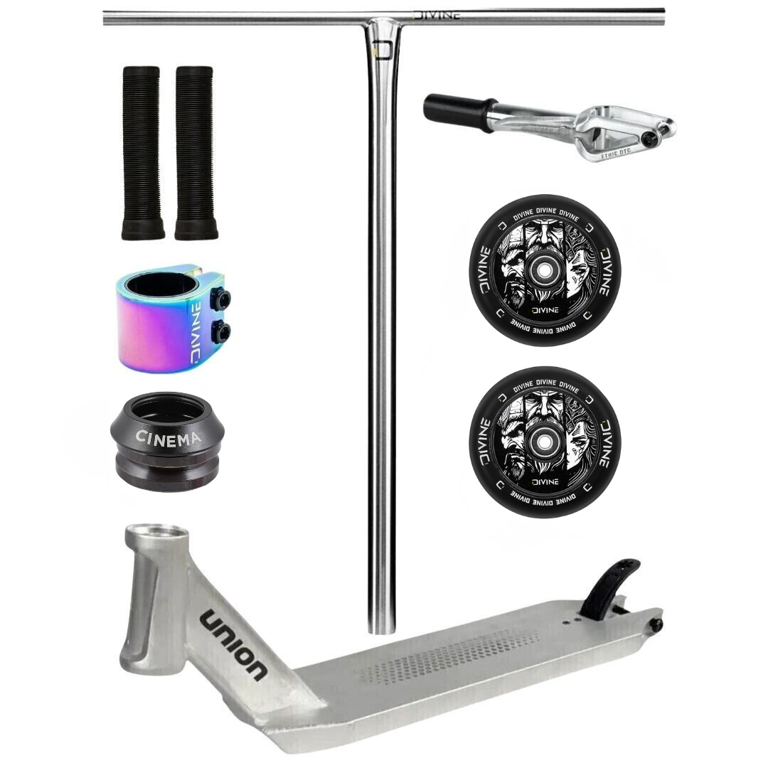 Tento custom jsme postavili tak, aby splňoval nároky jezdců, kteří hledají spolehlivý a lehký parkový setup. Základem je odlehčená deska Union Honeycomb, která je známá svou pevností a čistým designem. O rychlost a plynulou jízdu se starají kolečka Divine Hollow 110 mm spolu s přesnou IHC vidlicí Ethic a hladkým chodem headsetu Cinema. Ocelová T-řídítka Divine Standard pak dávají koloběžce stabilitu a kontrolu i při náročnějších tricích.
