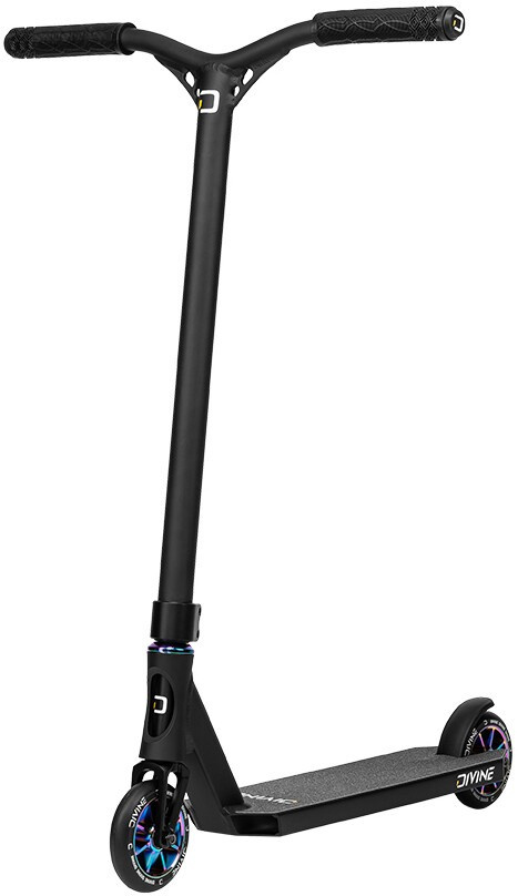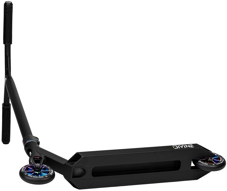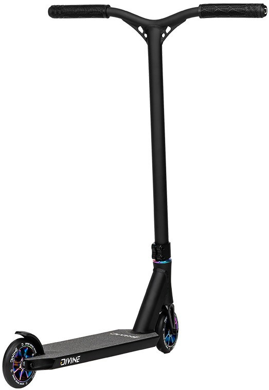 Divine Apollon je freestyle koloběžka určená pro mírně pokročilé/pokročilejší jezdce s výškou mezi 140 - 170 cm, pro které je skatepark něco jako druhý domov. Koloběžka je celo hliníková a díky tomu váží pouhých 3,2 kg. Na koloběžce jsou nasazená hliníková řidítka s Y-tvarem, díky čemuž jsou řidítka pevnější a mají hlavně měkké gripy. Řidítka stahuje dvou šroubová objímka, která krásně sedí na jednodílnou hliníkovou vidlicí. Koloběžka se krásně a hlavně potichu točí díky průmyslovým ložiskům, která jsou integrovaná v krku desky. Deska je opravdu lehká a překvapí vás svými rozměry. Na konci desky je plastová nášlapná brzda. Na koloběžce je nasazený pár 110 mm spoked koleček s hliníkovými středy.