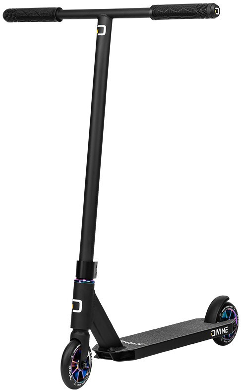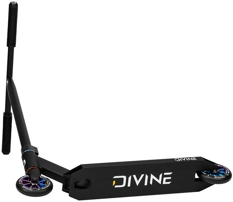 Měříš něco mezi 130-160 cm a chceš začít jezdit na freestyle koloběžce? Divine Godie je přesně to "pravý sametový"! Koloběžka je vyráběná z prémiového hliníku a oceli a díky tomu váží pouze 3,7 kg. Na koloběžce jsou nasazená "téčková" řidítka, díky zvolené oceli jsou řidítka pevnější a mají hlavně příjemně měkké gripy. Řidítka objímá dvou šroubovou objímku, která krásně pasuje na jednodílnou ocelovou vidlicí. Ladný a tichý chod zajišťují průmyslová ložiska, která jsou integrovaná v krku desky. Deska je skvěle zpracovaná a vyvážená díky čemuž s ní můžete jezdit jak ve skateparku tak i na ulici. Plastová brzda více vydrží a lépe se mačká. Koloběžka je osazena párem 110 mm spoked koleček s hliníkovými středy.
