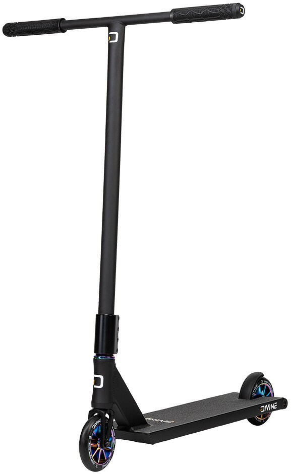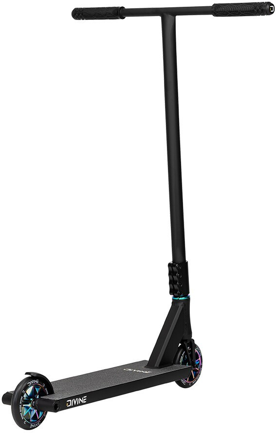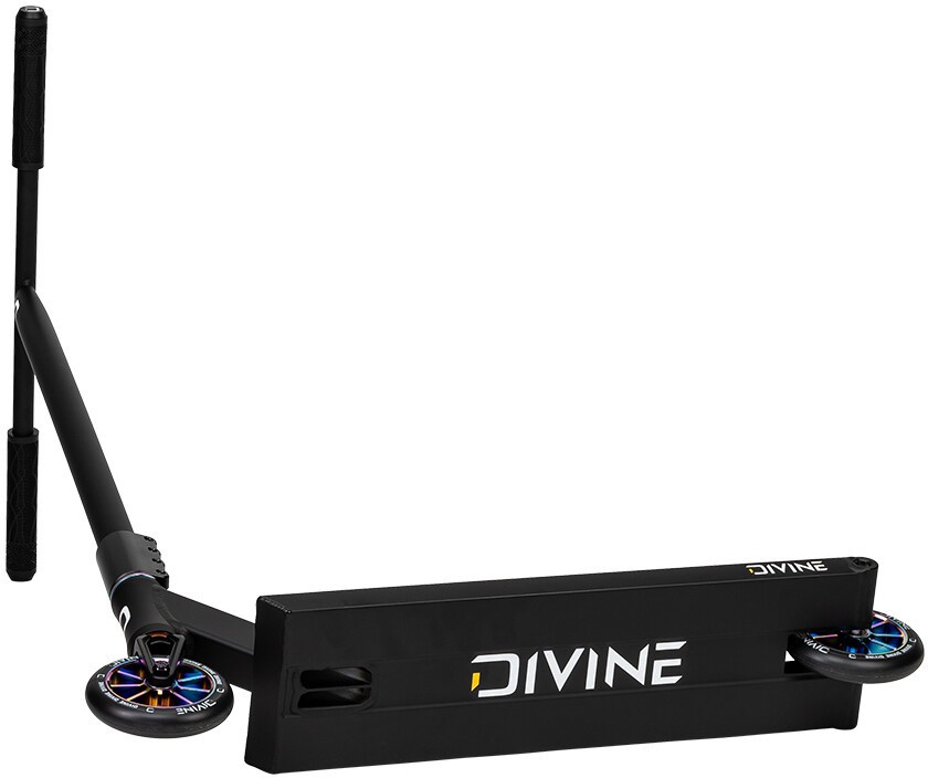 Divine Nyx je freestyle koloběžka určená pro mírně pokročilé/pokročilejší jezdce s výškou mezi 165 - 195 cm, kteří se chtějí zlepšovat hlavně v ježdění na ulici. Celá koloběžka váží 4,4 kg, což je vůči rozměrům skvělý poměr. Na koloběžce jsou nasazená ocelová řidítka s T-tvarem a měkkými gripy. Řidítka svírá čtyř šroubové SCS, která s jednodílnou hliníkovou vidlicí drží celou koloběžku pohromadě a zajišťuje tichý chod koloběžky. Koloběžka se krásně točí díky průmyslovým ložiskům, která jsou osazená v krku desky. Deska je skvělá svými rozměry, footspacem, hranatým koncem desky a plastovou nášlapnou brzdou. Na koloběžce je nasazený pár 120 mm koleček s hliníkovými středy.