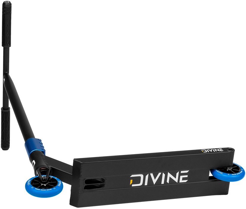 Divine Nyx je freestyle koloběžka určená pro mírně pokročilé/pokročilejší jezdce s výškou mezi 150 - 175 cm, kteří se chtějí zlepšovat hlavně v ježdění na ulici. Celá koloběžka váží 4,1 kg, což je vůči rozměrům skvělý poměr. Na koloběžce jsou nasazená ocelová řidítka s T-tvarem a měkkými gripy. Řidítka svírá čtyř šroubové SCS, která s jednodílnou hliníkovou vidlicí drží celou koloběžku pohromadě a zajišťuje tichý chod koloběžky. Koloběžka se krásně točí díky průmyslovým ložiskům, která jsou osazená v krku desky. Deska je skvělá svými rozměry, footspacem, hranatým koncem desky a plastovou nášlapnou brzdou. Na koloběžce je nasazený pár 110 mm koleček s hliníkovými středy.