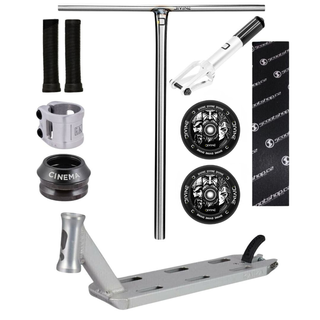 Tento custom je postavený na desce Longway Kaiza 480 mm, která je díky své délce ideální do skateparku. Kombinuje pevnost a odlehčenou konstrukci, takže poskytuje perfektní stabilitu při whipech a rotacích. O rychlou a plynulou jízdu se starají kolečka Divine Spoked 110 mm, zatímco vidlice Divine HIC/SCS a hladký headset Cinema zajistí přesný chod bez vůlí.