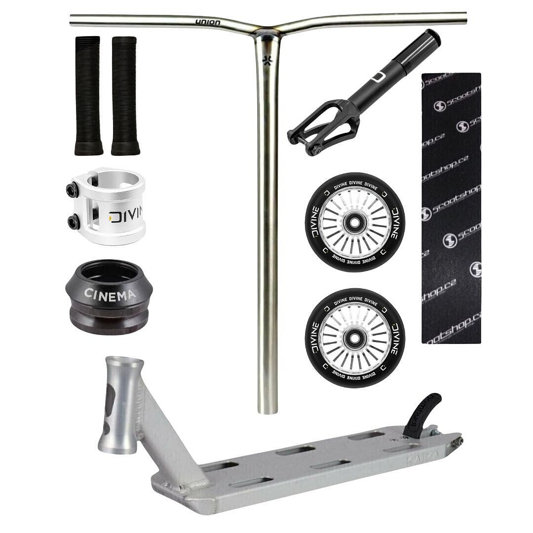Tento custom je postavený na desce Longway Kaiza 480 mm, která je díky své délce ideální do skateparku. Kombinuje pevnost a odlehčenou konstrukci, takže poskytuje perfektní stabilitu při whipech a rotacích. O rychlou a plynulou jízdu se starají kolečka Divine Turbo 110 mm, zatímco vidlice Divine HIC/SCS a hladký headset Cinema zajistí přesný chod bez vůlí.
