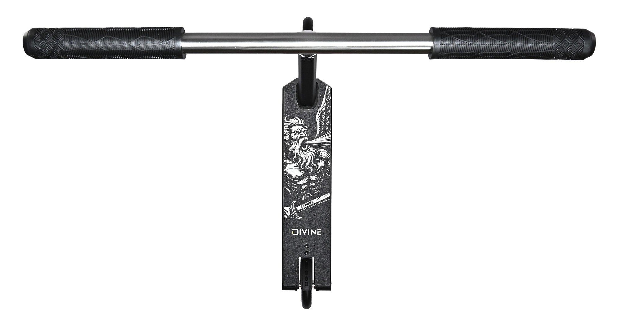Velkou změnou oproti menším modelům jsou také řídítka. U verze Divine Zephyr L Hybrid jsou použitá T řídítka z odlehčené oceli o rozměrech 650 x 570 mm. Ocelová řídítka dávají větší pevnost a jiný feeling v rukách, zatímco T tvar je oblíbený mezi ridery, kteří chtějí čistý vzhled, dobrou kontrolu a jistotu při tvrdším ježdění.