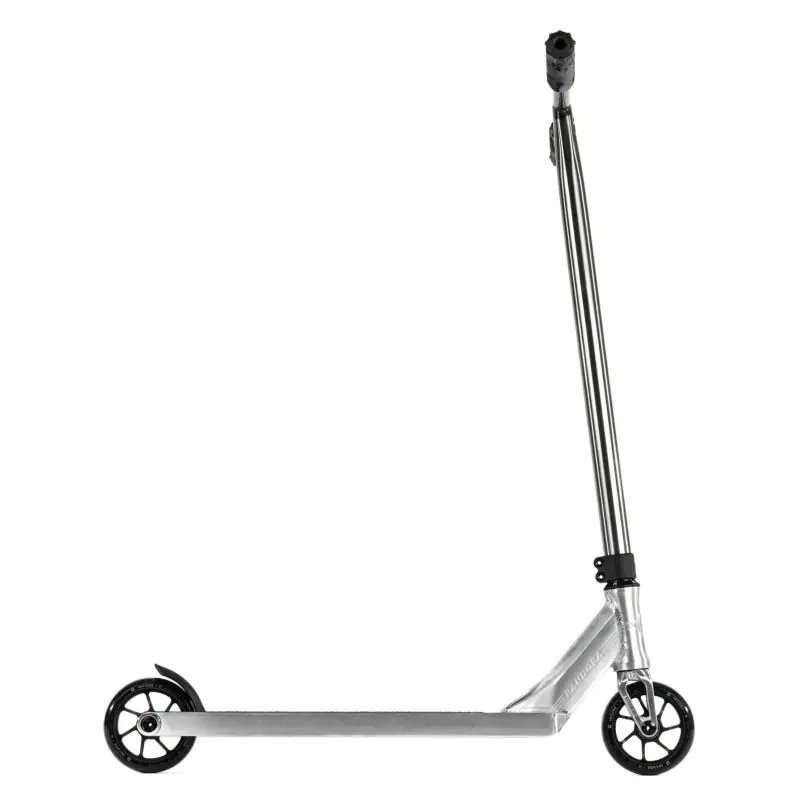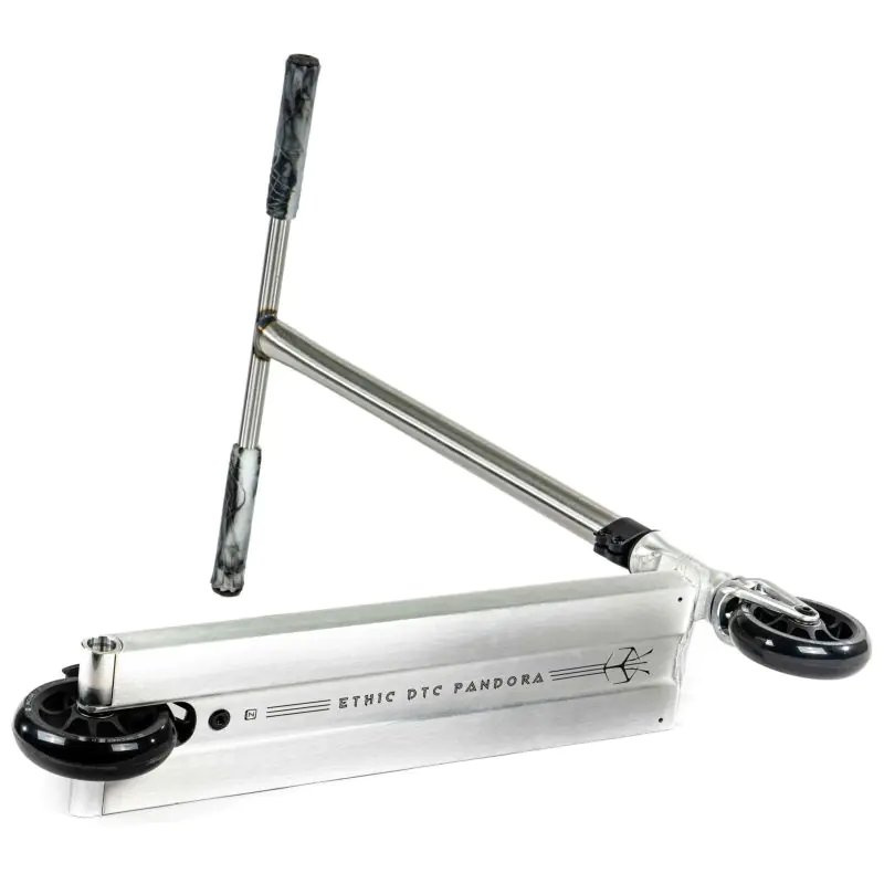 Ethic Pandora je koloběžka určena pro mírně pokročilé jezdce, kteří se chtějí naučit základy streetu i skateparku. Koloběžka je vyráběna tak aby vydržela úporné streetové ježdění ale zároveň tak aby byla co nejlehčí do skateparku. Hmotnost koloběžky je pouhých 3,33kg. Na koloběžce jsou ocelová Téčková řidítka s rozměry 620x570 mm.Na řidítkách jsou nasunuty nové Ethic Slim gripy. Deska koloběžky je univerzální hybrid mezi skateparkovým a streetovým ježděním a to právě díky Box-endovému konci. Rozměry desky jsou 520 mm na délku, 130 mm na šířku a 350 mm na footspace. Materiál desky je hliník 6061 se stupněm pevnosti T6. Celá koloběžka drží pohromadě díky jednodílné hliníkové vidlici a HIC kompresnímu systému. Koloběžka je osazena párem 12STD koleček s rozměrem 115x30 mm s hliníkovými středy. Na konci koloběžky naleznete flex fender plastovou brzdu.