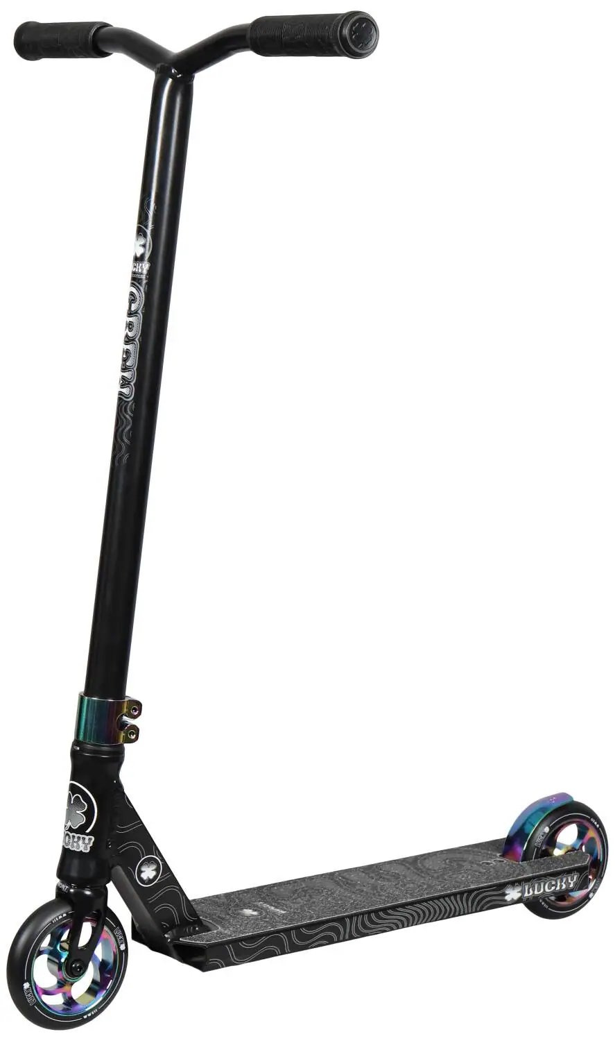 Nová Lucky Crew koloběžka je konečně tady! Hezčí, lehčí a pevnější! Koloběžka je určena pro starší začátečníky a mírně pokročilé jezdce do skateparku. Váha pouze 3,3kg! Na koloběžce jsou Y hliníková řidítka o rozměrech 584 mm na výšku a 559 mm na šířku. Deska má délku 480 mm a šířku 114mm což je super pro triky ve skateparku. Koloběžka je osazena párem 115mm koleček s paprskovým, hliníkovým středem a šířkou 24mm.
