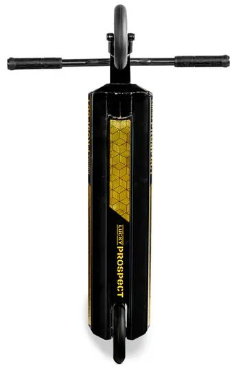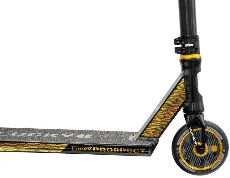 Lucky Pro Scooters je americká značka koloběžek a příslušenství od roku 2009. Pro rok 2022 si Lucky připravilo spoustu novinek a mezi to patří i nové Prospect koloběžky. Model Prospect je určen pro mírně pokročilé i pokročilé jezdce do skateparku. Celková hmotnost koloběžky je 3100 gramů a to díky tomu že většina koloběžky je hliníková. Na koloběžce jsou hliníková Y řidítka, která měří 622 x 597 mm. Deska byla vytvořena jezdci do skateparku, tudíž má Peg-cut a super rozměry (Délka 500 mm, Šířka 120 mm a Footspace 360 mm). V desce je bezzávitová, jednodílná, hliníková vidlice. Na vidlici je nasazen IHC shim, díky kterému drží koloběžka v jednom kuse. Koloběžka je osazena párem 120 mm koleček o šířce 24 mm. V každém kolečku jsou 2 ABEC9 ložiska, která zajišťují plynulou jízdu. Na konci desky je ocelová flex fender brzda