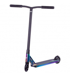 Výborná lehká koloběžka ideální pro začátečníky. Díky T řídítkům z oceli se snadno naučíte triky jako no hand, barspin atd. Lehká deska s obdélníkovým tvarem je super pro naučení základních grind triků. (lépe drží na povrchu překážky). 110mm kolečka mají plastový střed. Vidlice je ocelová se závitovým headsetem. Výborná do skateparku