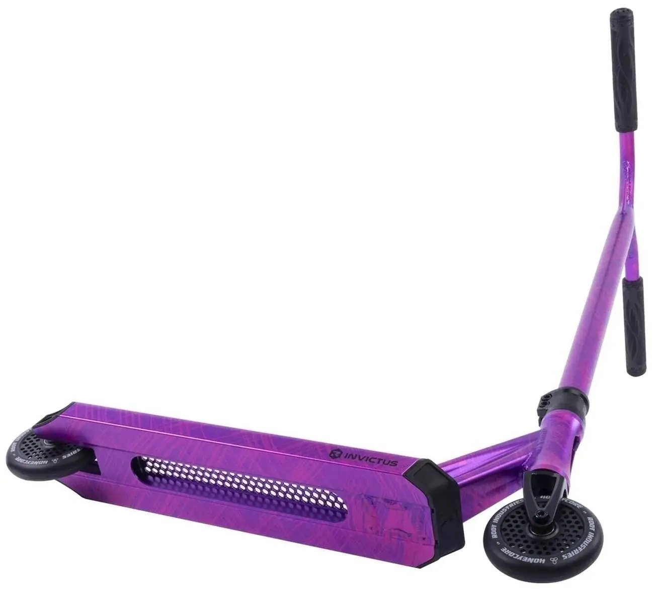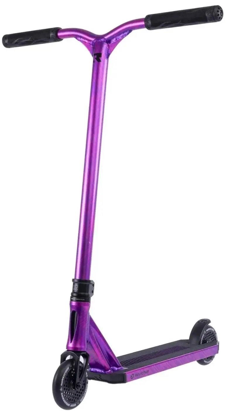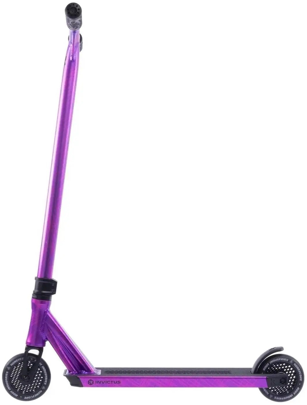 Skvělá koloběžka pro mírně pokročilé jezdce do skateparku od australské značky Root Industries. Invictus 2 ETCH je limitkou a vypadá skvěle. Celková hmotnost koloběžky je pouhých 3352 g. Celková výška koloběžky je 850 mm. Koloběžka vyniká svou odlehčenou hliníkovou deskou. Deska je jednodílná a konec desky je zkosený(takzvaný Peg-cut). V desce jsou udělané díry na odlehčení a zároveň vypadají skvěle designově. Koloběžka má kompresní systém IHC díky čemuž se použili hliníková řidítka ve tvaru Y. Rozměry řidítek jsou 610 mm na výšku a 580 mm na šířku. Na koloběžce je pár známých Root Industries Honeycore 110 mm koleček. A na konci desky je plastová flex fender brzda.