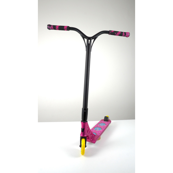 Takže tohle je setup do parku, postavený na SCS, aby byl co nejpevnější. Začeneme řidítkama. Osvědčená kvalita v podobě Ethic Almasty, který jsou pevná ocelová stylovka . Na nich jsou nasazený starý dobrý Blunt V2 gripy, který jsou pohodlný jak postel ráno, když se ti nechce vstávat. Přesuneme se na opačnou stranu, kde má svoje místo naprosto libová Ethic Merrow vidlice. Ve vidlici sedí jedno ze dvou koleček Chubby Melocore Banana Simulator. A zlatý hřeb celýho setupu signature deska od Loco Doughnut od Chubby. A ni je nalepenej vymazlenej griptape Chubby Dohnut. Shrnuto a podtrženo...prostě kvalita za dobrý prachy.