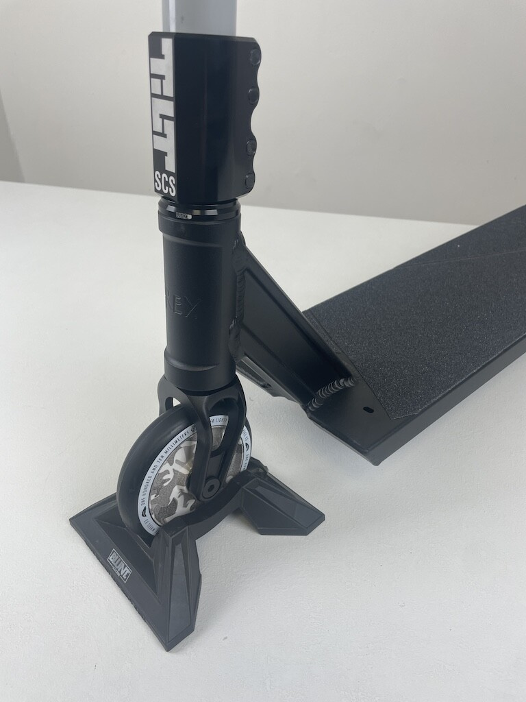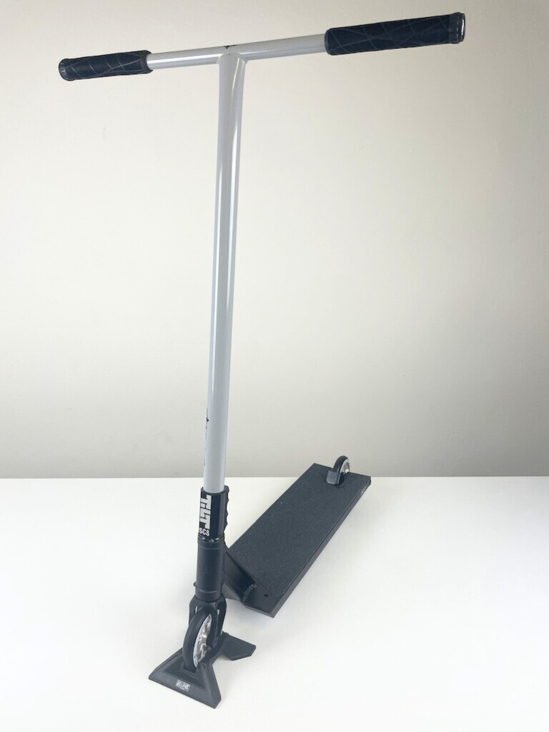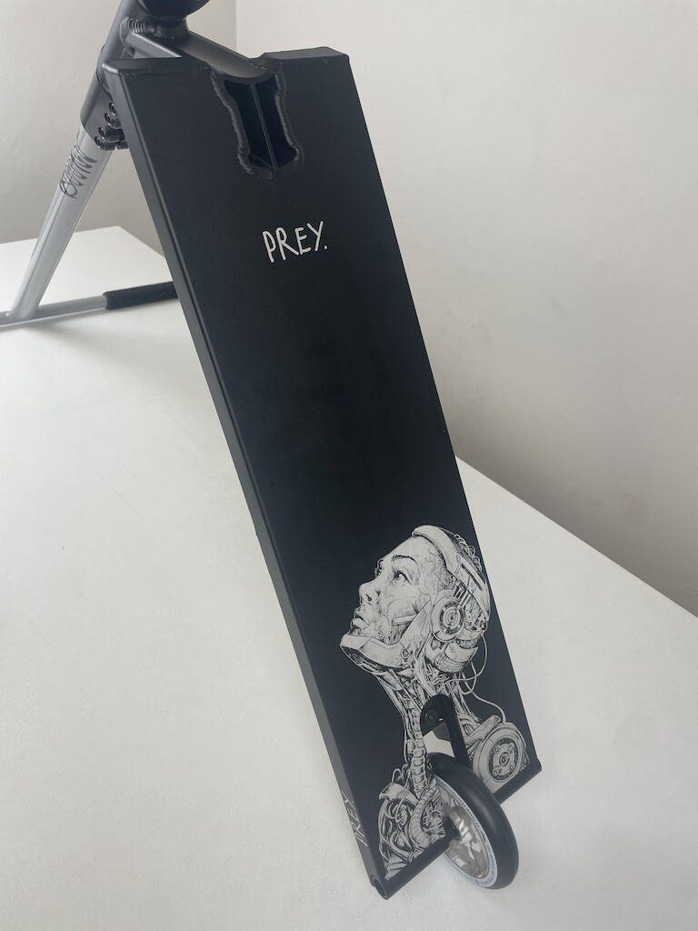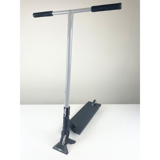 Tahle streetová koloběžka je určena pro pokročilejší jezdce ve výškovém rozmezí 170-200 cm na street. Hmotnost koloběžky je 4,8 kg. Na koloběžce jsou pevná ocelová řidítka Addict s rozměry 720x640 mm. Na řidítkách jsou nahozené taktéž Addict gripy. Koloběžka drží pohromadě díky SCS kompresnímu systému od americké značky Tilt. Vidlice byla při skládání jasnou volbou a tou byla Tilt Stage 1. Pro ladné otáčení koloběžky jsme zvolili hlavového složení Lucky. Na spodku koloběžky můžete nalézt Prey Tomorrow desku s rozměry 595 mm na délku, 170 mm na šířku a 440 mm jako footspace. Na desce je nalepený černý jessup griptape. A aby to celé ladilo tak jsme zvolili Striker Lightly kolečka o průměru 110 mm.