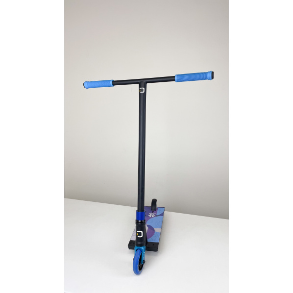 Tenhle topový Build up je určen pro mírně pokročilé/pokročilejší jezdce pro které je využití koloběžky na street i park zároveň nutností. Celková hmotnost této koloběžky je pouhých 3600 gramů což je vůči velikosti koloběžky skvělý parametr. Na koloběžce je nasazená Divine street deska s rozměry 520x153 mm (délka x šířka) a footspacem 400 mm. Dále na koloběžce najdeme kvalitní řidítka z odlehčené oceli od značky Divine ve tvaru T a s rozměry 650 x 620 mm. Na řidítkách jsou nasazené ODI gripy ve světle modré barvě. Koloběžka drží pohromadě díky HIC kompresnímu systému zajištěného objímkou Divine Classic. HIC je propojený s Divine vidlicí. U hlavového složení je jasná volba Divine, skvělý headset s integrovanými a zapouzdřenými ložisky. Celá koloběžka byla následně osazena 110 mm kolečky s hliníkovými středy od značky Divine Spoked.