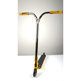 Potřebuješ něco co ti bude ladit k tvýmu zlatýmu chainu? Tak tenhle Build Up je přesně to co hledáš! Tahle koloběžka je určena pro mírně pokročilé jezdce do skateparku co se chtějí odlišit. Na koloběžce jsou ocelová řidítka Ethic Dildegast řidítka s velmi odlišným designem a rozměry 670x610 mm. Na řidítkách jsou nahozené klasické Bestial Wolf Mixed gripy. Jako kompresní systém byl zvolen IHC díky tomu že se bere jako spolehlivý a lehký. Řidítka stahuje dvoušroubová Root Industries objímka. Jako vidlici jsme zvolili Oath Shadow, která tam sedí jak zadnice na hrnec. Na spodku koloběžky naleznete zlatou Chilli Reaper desku s rozměry 500 mm na délku a 115 mm na šířku. Kolečka jsou důležitým aspektem koloběžky a právě proto jsme zvolili naše Scootshop kolečka o velikosti 110 mm.