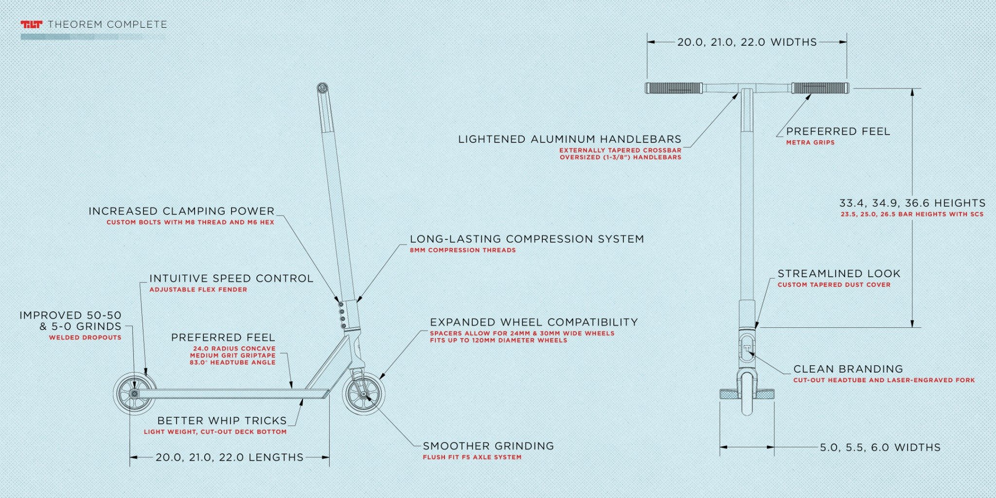 Výborná, lehká street koloběžka od známe značky Tilt. Tilt se vždy soustředilo na kvalitu dílů. A už bylo načase aby přišli se svojí vlastní koloběžkou. Vyrobili velice kvalitní koloběžku, která ma úžasnou hmotnost! Výborná deska s boxcut a hladkým spodním povrchem (žádné grindraily). Díky tomu grindování půjde snadněji. SCS zajištuje vyšší pevnost řídítek a vidlice. Řídítka nemají zářez. Díky tomu vydrží déle a jsou vyrobené z hliníku. (lehčí, lépe se dělají triky). 110mm kolečka s hliníkovým středem jsou samozřejmostí.