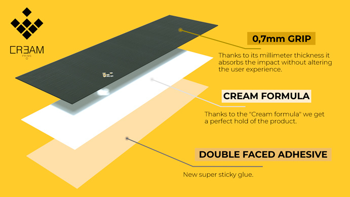 Nové Creamgriptapy od značky Cream Prime jsou revolučními griptapy, které si zamilujete díky jejich vlastnostem. Tyto griptapy jsou vyrobeny z neabrazivních materiálů, díky kterým můžete provádět na své koloběžce jakékoli triky (fingerwhip, superman atd.) bez toho, aniž by se vám poškodili boty a zároveň má skvělou přilnavost. Creamgriptapy netvoří žádné bubliny a velice snadno se nanáší na desku koloběžky. Stačí jen nalepit Creamgriptape na desku, poté jej oříznout podél okrajů pod úhlem 45 °. Griptapy lze od desky oddělit a můžete si jej dát na jinou desku. Creamgriptapy jsou vyrobené z "GUMY", díky čemuž jsou vodotěsné a snadno se čistí vlhkým hadříkem.