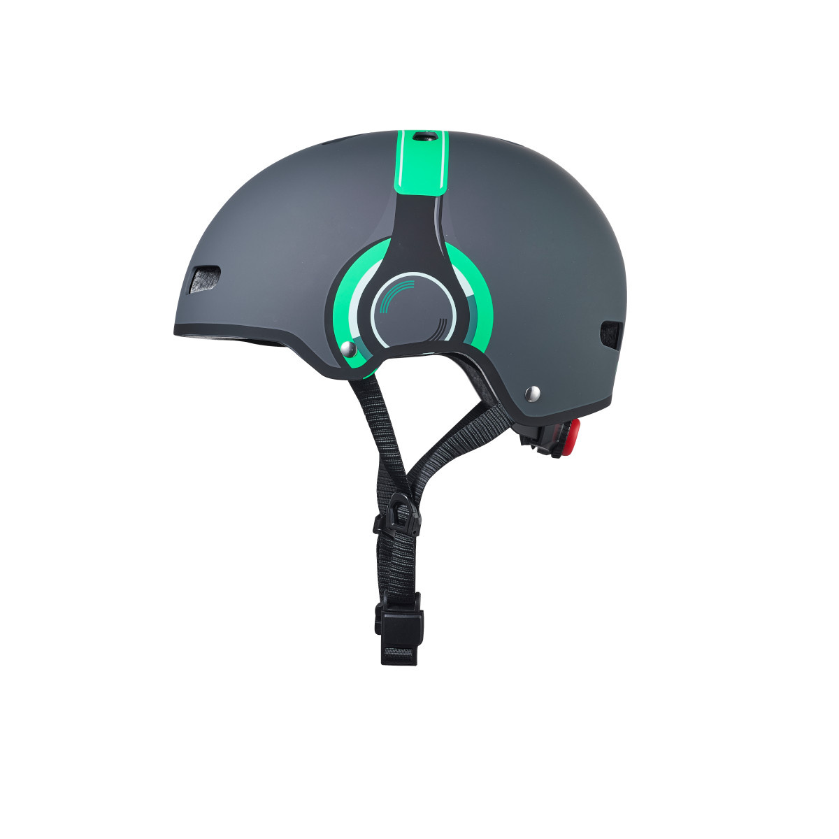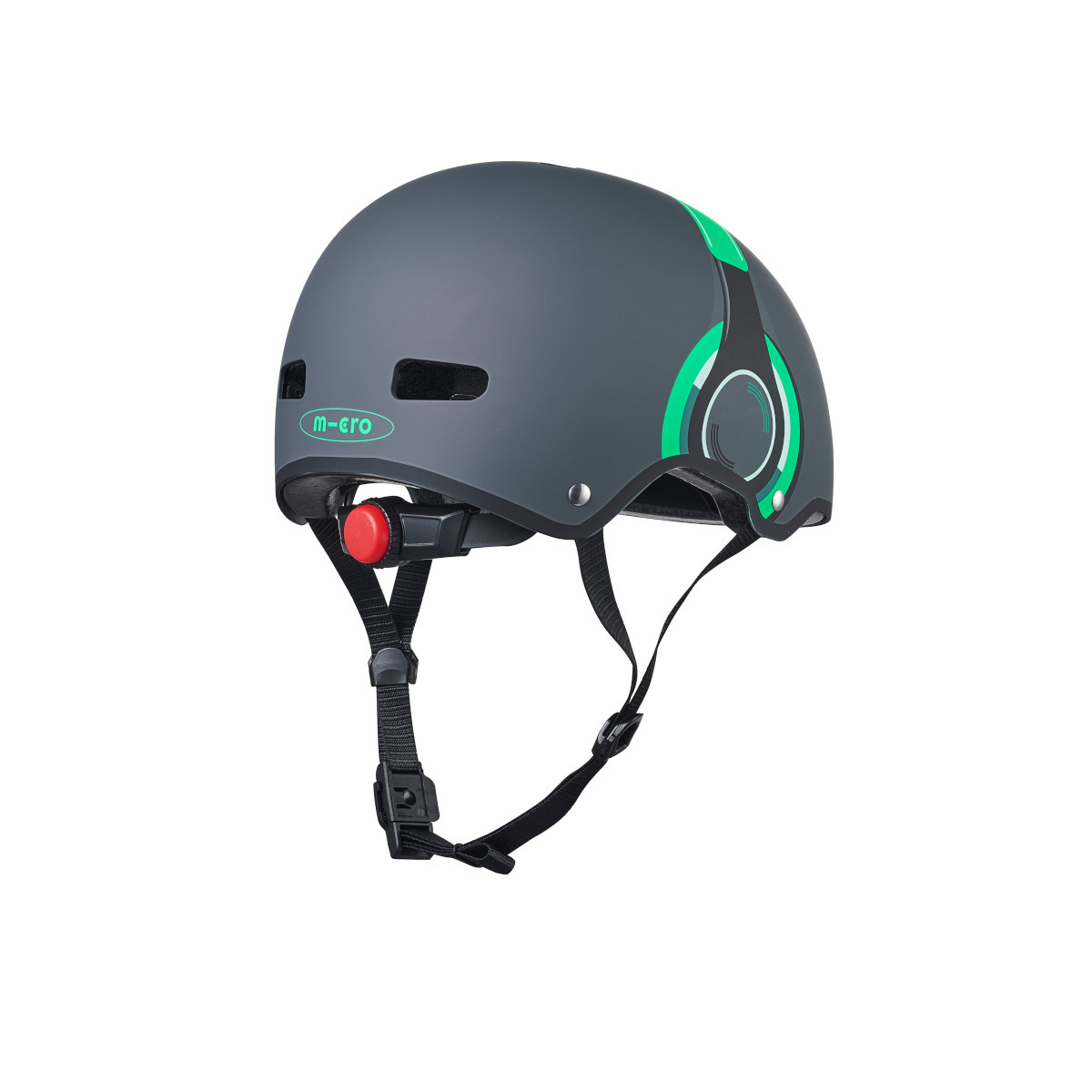 Bezpečná helma značky Micro s nastavitelnou velikostí pomocí upínacího kolečka. Jedná se o šedou helmu s moderním dekorem zelených sluchátek. Helma je vhodná pro jízdu na koloběžce, dětském odrážedle, kolečkových bruslích a skateboardu. Extra polstrování uvnitř helmy pro větší komfort a bezpečí. 10 větracích otvorů zajistí kvalitní odvětrávání hlavy. Inovativní magnetický systém zapínání výrazně zvyšuje bezpečnost a zjednodušuje zapínání řemínku pod bradou.