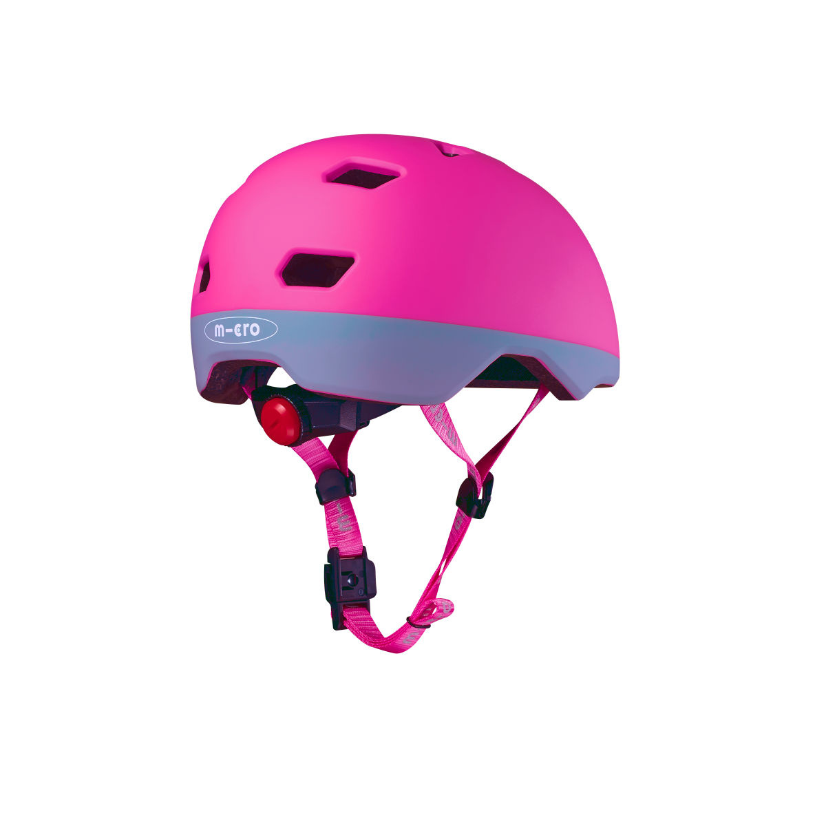 Bezpečná helma značky Micro s nastavitelnou velikostí pomocí upínacího kolečka. Helma je vhodná pro jízdu na koloběžce, dětském odrážedle, kolečkových bruslích a skateboardu. Díky neonově růžové barvě a reflexním páskům pod bradou je velmi dobře viditelná a zvyšuje bezpečnost jezdce. 12 větracích otvorů zajistí kvalitní odvětrávání hlavy. Extra polstrování uvnitř helmy pro větší komfort a bezpečí. Inovativní magnetický systém zapínání výrazně zvyšuje bezpečnost a zjednodušuje zapínání řemínku pod bradou.