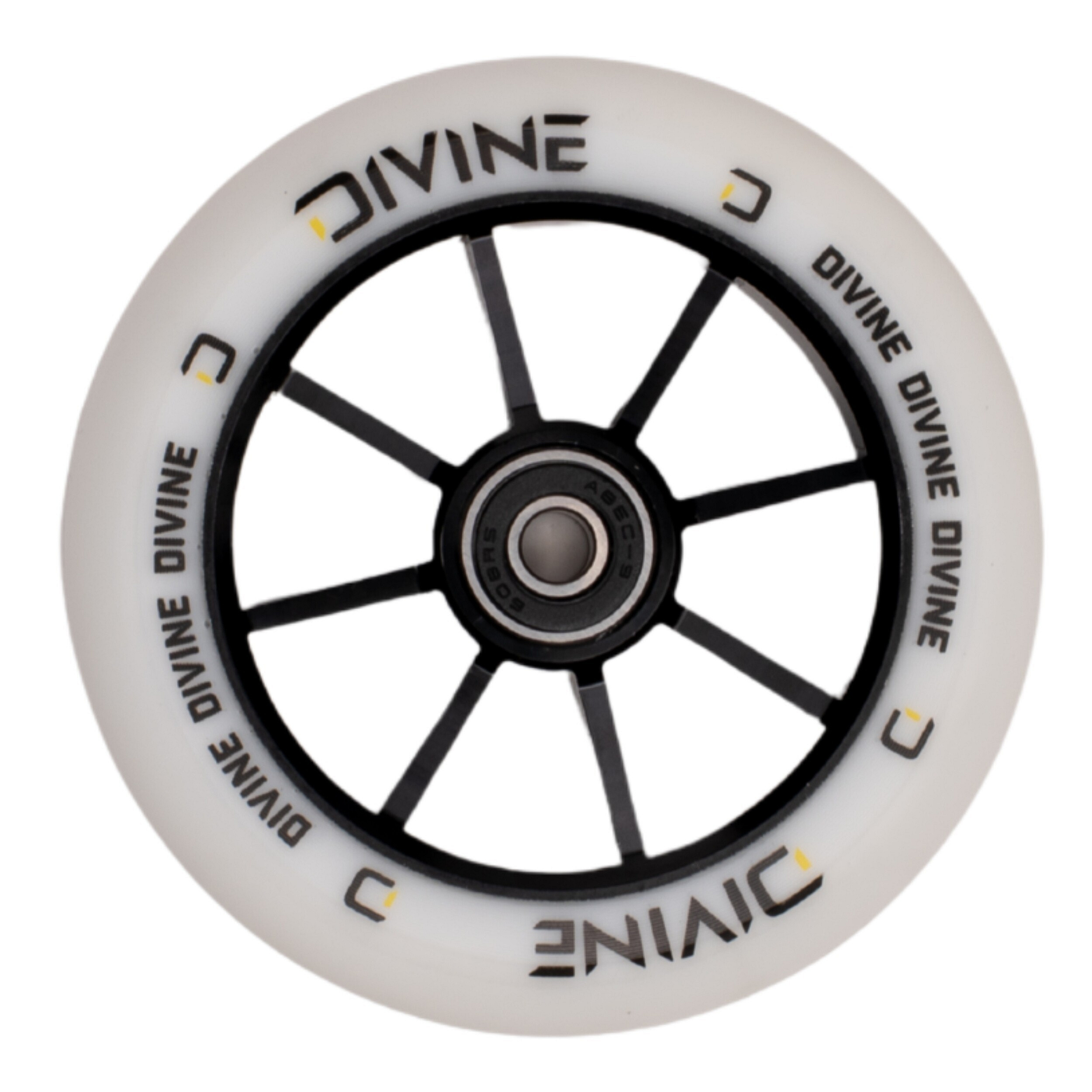 Výborné 110 mm kolečka s hliníkovým středem od nové české značky Divine. Šířka kolečka je standardní 24 mm. Ložiska ABEC 9 zaručují skvělou rychlost.