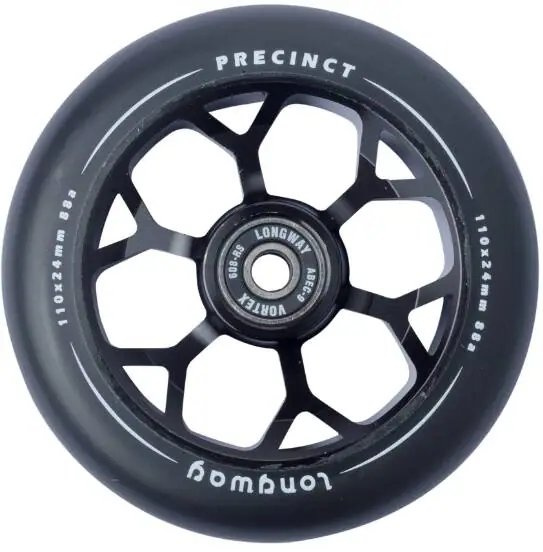 Kolečko Longway Precinct opravdu umí zaujmout svým agresivním vzhledem. Kolečko se vyrábí o průměru 110 mm a o šířce 24 mm. Kolečko má hliníkový střed s paprskovým vzhledem. Profil kolečka je kulatý, tudíž lépe přilne k povrchu. Hmotnost kolečka je 223 gramů. V kolečku jsou osazena kvalitní ABEC 9 ložiska. V BALENÍ NALEZNETE 1 KOLEČKO.
