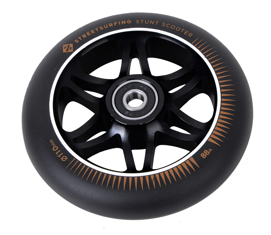 Street Surfing 110 mm kolečka s hliníkovým středem dorazili i k nám. Kolečko má hmotnost krásných 200 gramů. Tvrdost gumy je 88A. Kolečko je osazeno párem ABEC9 ložisek. V balení naleznete 1 kolečko.