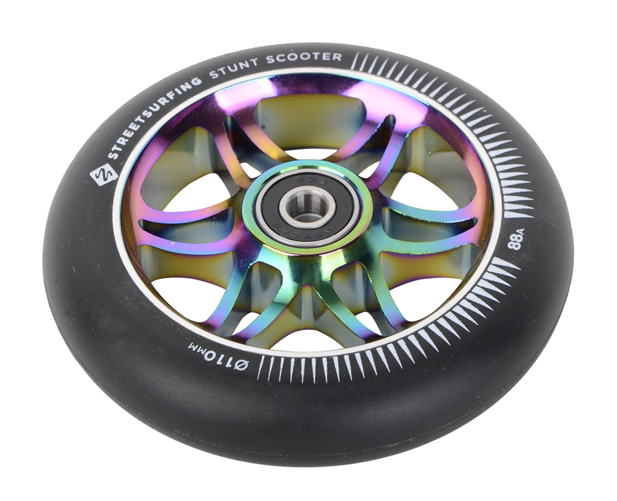 Street Surfing 110 mm kolečka s hliníkovým středem dorazili i k nám. Kolečko má hmotnost krásných 200 gramů. Tvrdost gumy je 88A. Kolečko je osazeno párem ABEC9 ložisek. V balení naleznete 1 kolečko.