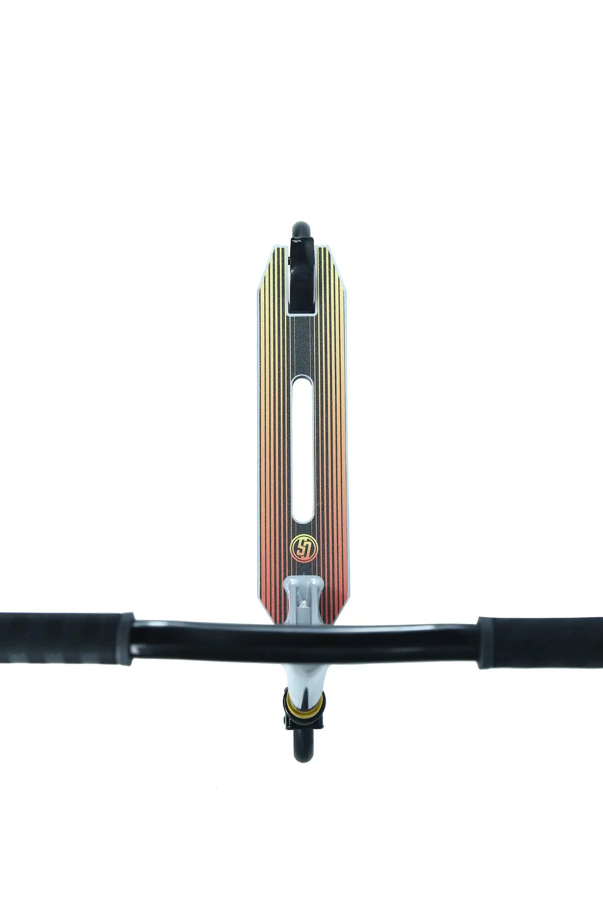 Řídítka o výšce 570 mm a šířce 457 mm jsou vyrobena z vysokopevnostní oceli a poskytují vynikající kontrolu a stabilitu. Ta jsou k palubě připevněna pomocí integrovaného 1 1/8" hlavového složení pro plynulé řízení a snadnou údržbu. Palubní deska o délce 48 cm a šířce 11,4 cm je vyrobena z lehkého hliníku a je vybavena výřezy na kolíky pro větší univerzálnost. Nabízí také dostatek prostoru pro pohodlné provádění triků jezdci všech velikostí. Brzda Flex Fender poskytuje spolehlivou brzdnou sílu a zajišťuje bezpečnost a kontrolu při jízdě.