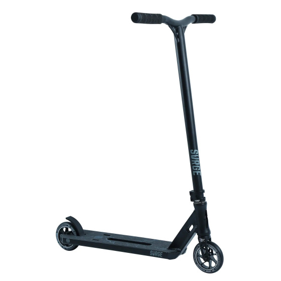 Koloběžka Surge Pro je vybavena pevnou a lehkou hliníkovou palubou s výřezy pro kolíky, ocelovými T-řidítky, kompresí HIC, integrovaným hlavovým složením a 110mm kolečky Crisp Core, která zajišťují hladkou jízdu a jsou skvělá pro učení nových triků.